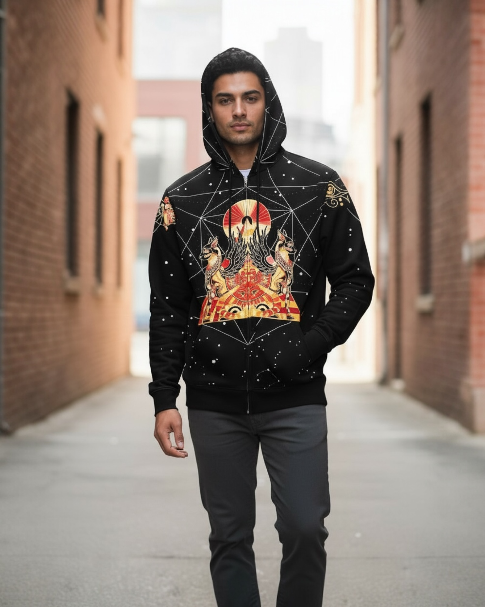 Built from fleece-lined polyester, this zip-up hoodie is ultra-soft, fade-resistant, and cut for movement—perfect for festivals, rituals, and everyday magic.