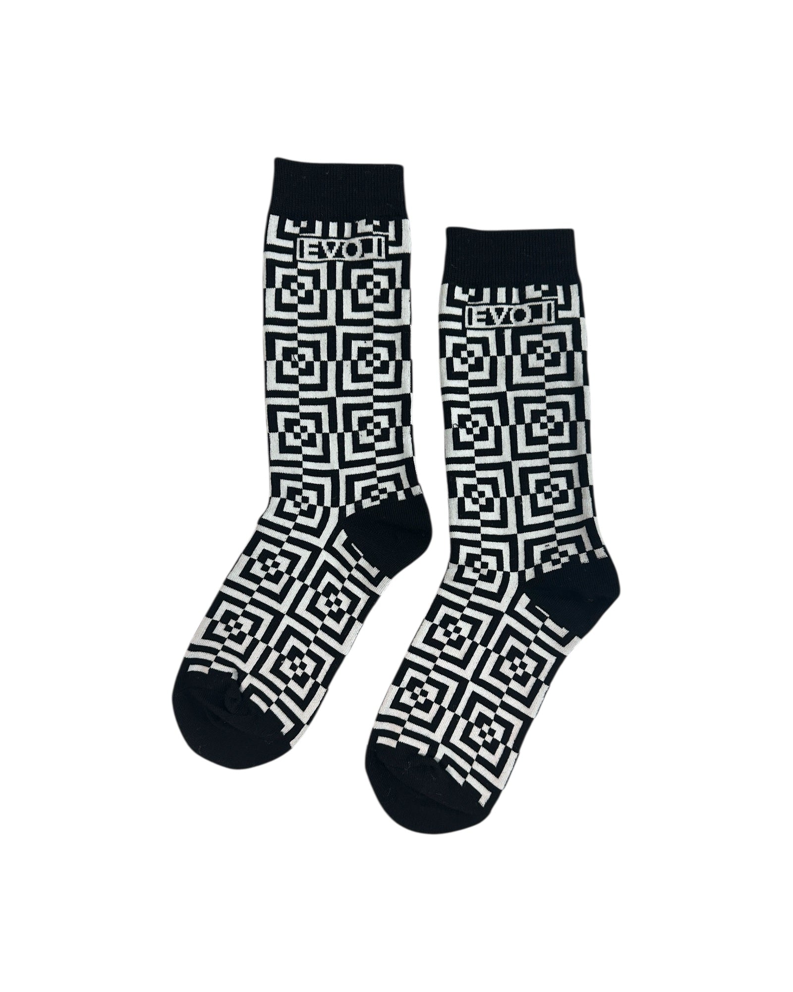 The Quadrant Socks (Black & White) play with symmetry, contrast, and repetition in a clean, mid-calf silhouette made for everyday wear. Knit in soft cotton with a bold quadrant pattern, these socks ground any look while staying comfortable, breathable, and easy to move in.