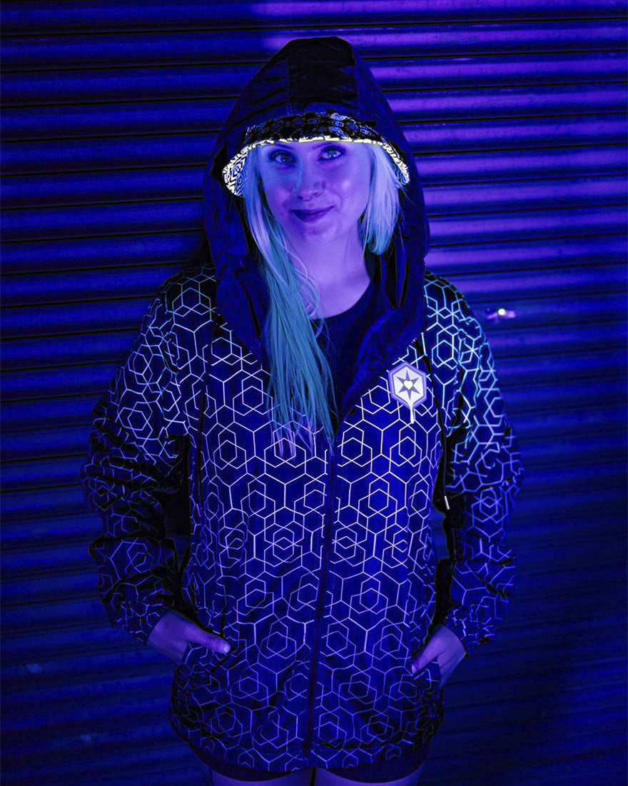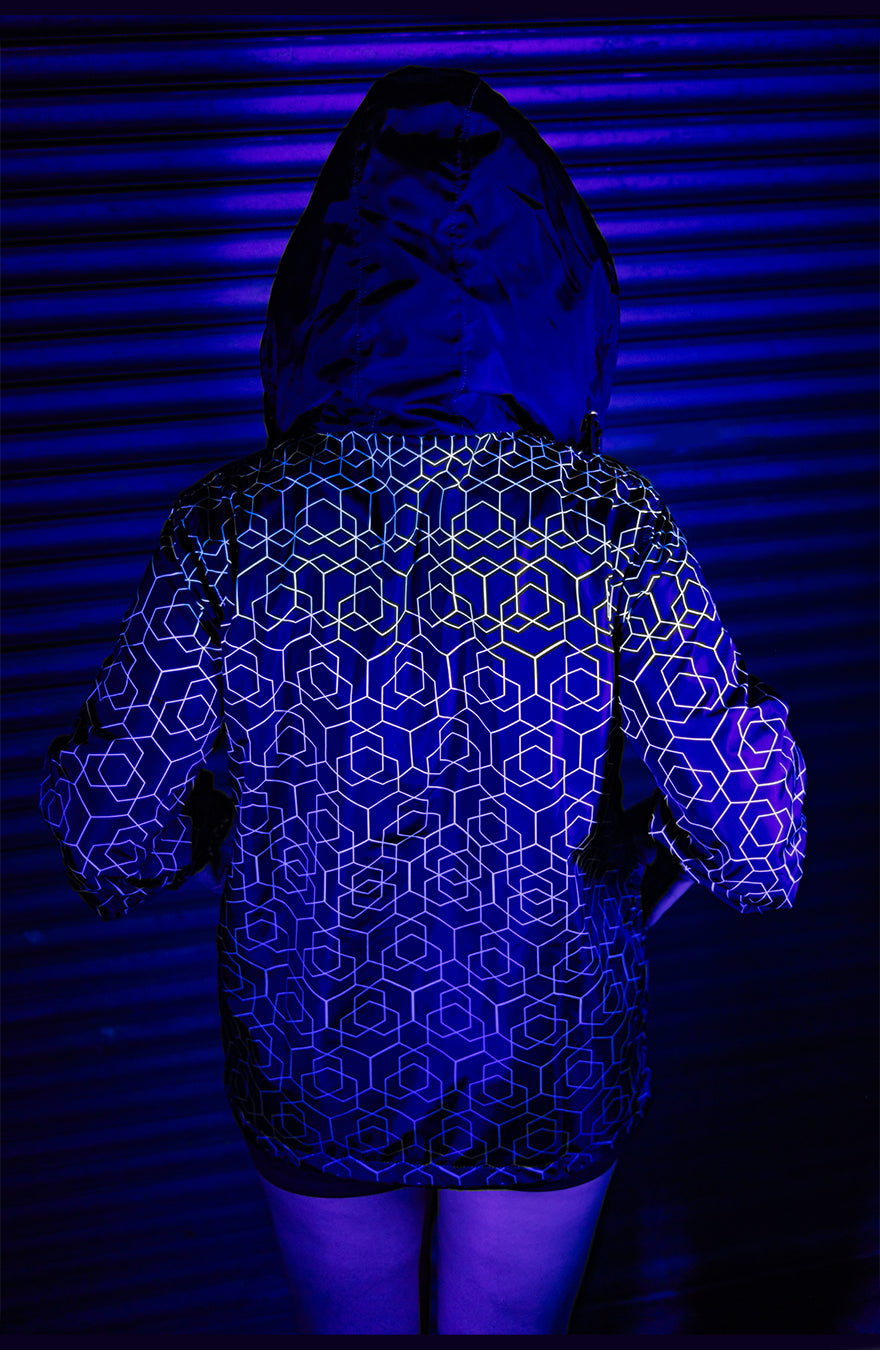 The Geo Sublimated Rain Coat by Erika Lizette is built for the elements — a fusion of sacred geometry, bold symmetry, and functional flow. Fully sublimated from hood to hem, this lightweight UV-reactive shell turns weather into a backdrop and movement into a statement. Designed to keep you dry without slowing your rhythm, it’s the perfect layer for festivals, city nights, and unexpected adventures.