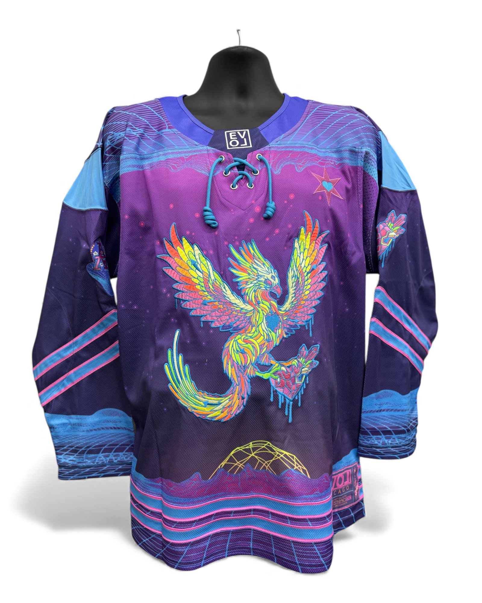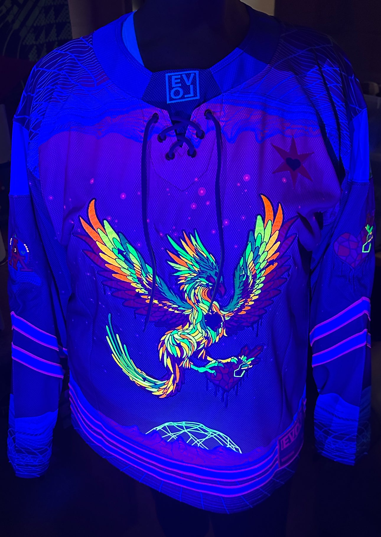 • Full-body sublimated “Phoenix Heart” artwork by Ancient Aesthetics (Mike Swanson)