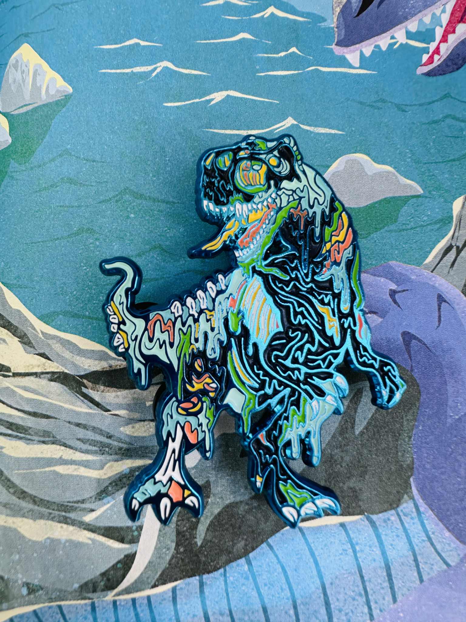 The Lost Lands: The Lost Undead T-Rex Pin Set stomps into the festival scene with prehistoric power and undead energy, captured in Erika Lizette’s signature linework and color styling. Each variant glows with UV-reactive accents and limited edition counts, making this set a must-have for collectors and festival fam alike.