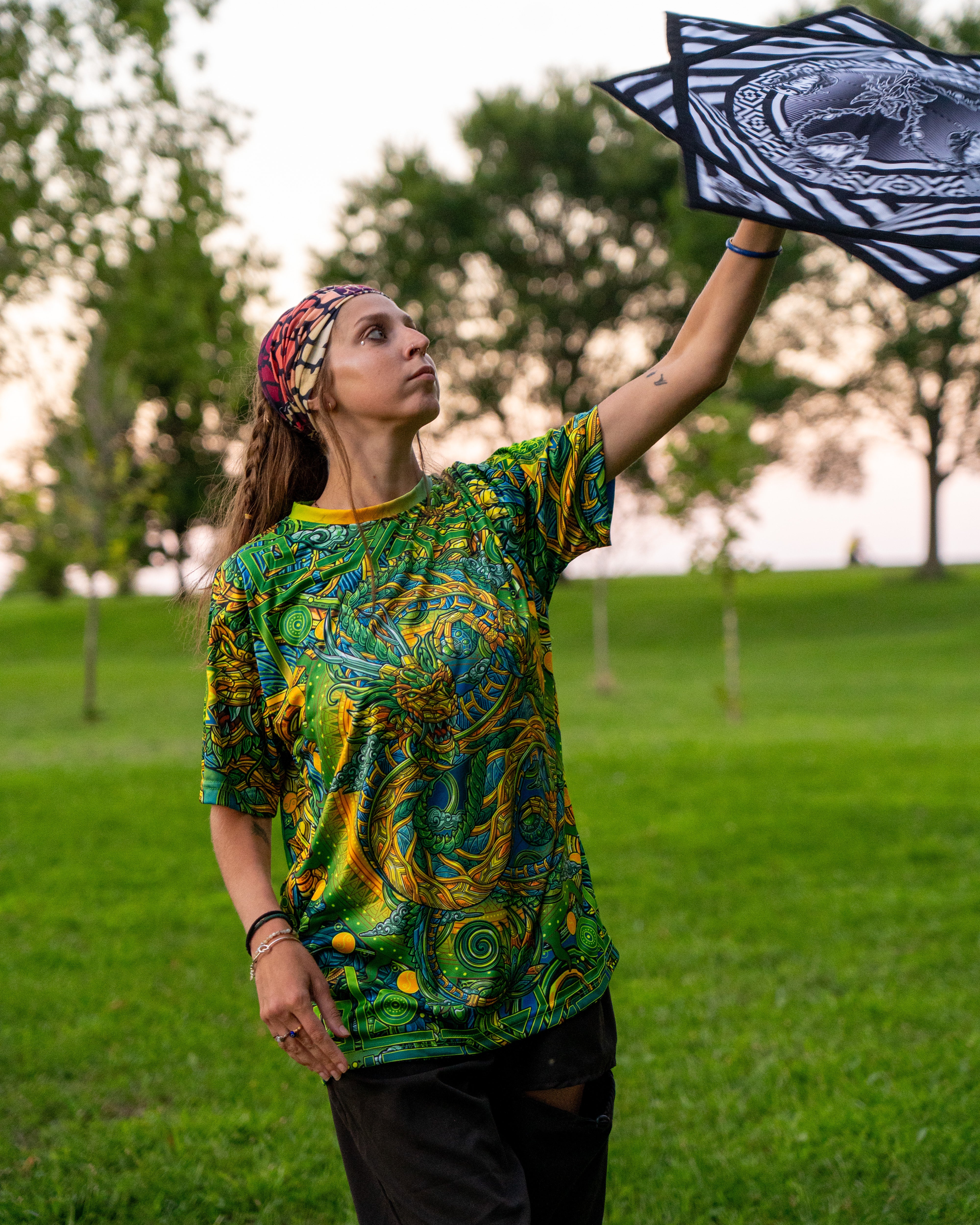Hand wash cold, hang dry. Avoid high heat and harsh chemicals to preserve print and UV glow.