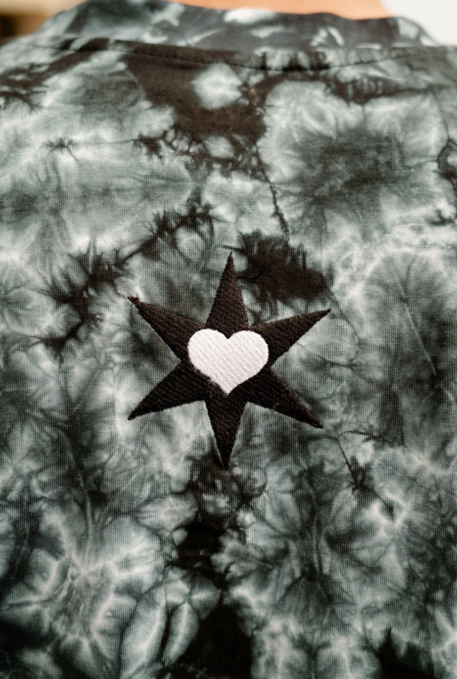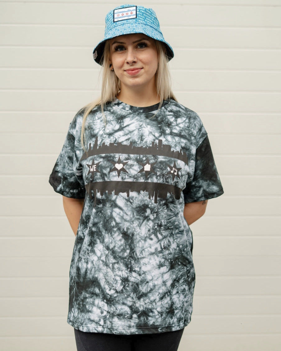 The We Love House Music Midnight Tie-Dye T-Shirt is a love letter to Chicago’s pulse. Printed with our skyline silhouette and iconic “We ♥︎🏠🎶” symbols, this custom tie-dye tee moves to the rhythm of the city. Soft, breathable, and washed in midnight tones—this one’s made for the dance floor, the rooftop, and everything in between.